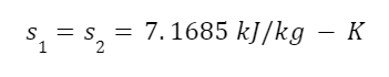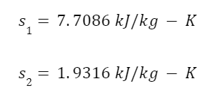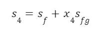 The entropy of the fluid before and after expansion is the same but some of it condenses. This isn’t good for the turbines but it happens nonetheless. Ideally, most of the fluid is still vapor so the ratio of the mass that is saturated vapor to the total fluid mass is called “quality”. The entropies of saturated liquid, sf, and of evaporation, sfg, are very different. So we can use algebra to calculate the quality, x2, of the fluid. The total entropy of the expanded fluid is given by the equation: