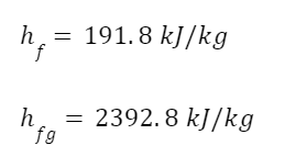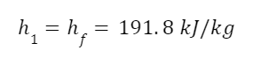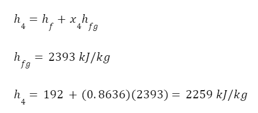 For the fluid leaving the turbine we need to calculate the enthalpy using the quality, since it’s part liquid, part vapor. We need the enthalpy of saturated liquid, hf, and of evaporation, hfg. The total enthalpy of the fluid leaving the turbine is given by the formula