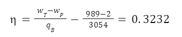 So we have the work input of the pump, the heat input of the boiler, and the work output of the turbine. The maximum possible efficiency is: