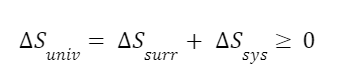 The entropy change in a system can be negative but the balance of the change in system entropy, entropy in, entropy out, and entropy of the surroundings will never be negative. We can look at the change of entropy of the universe as a function of the entropy change of a system and the entropy change of the system’s surroundings.