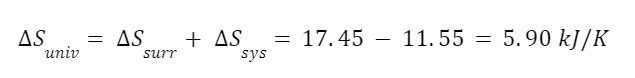 The entropy of the surroundings increases. And the total entropy change of the universe is: